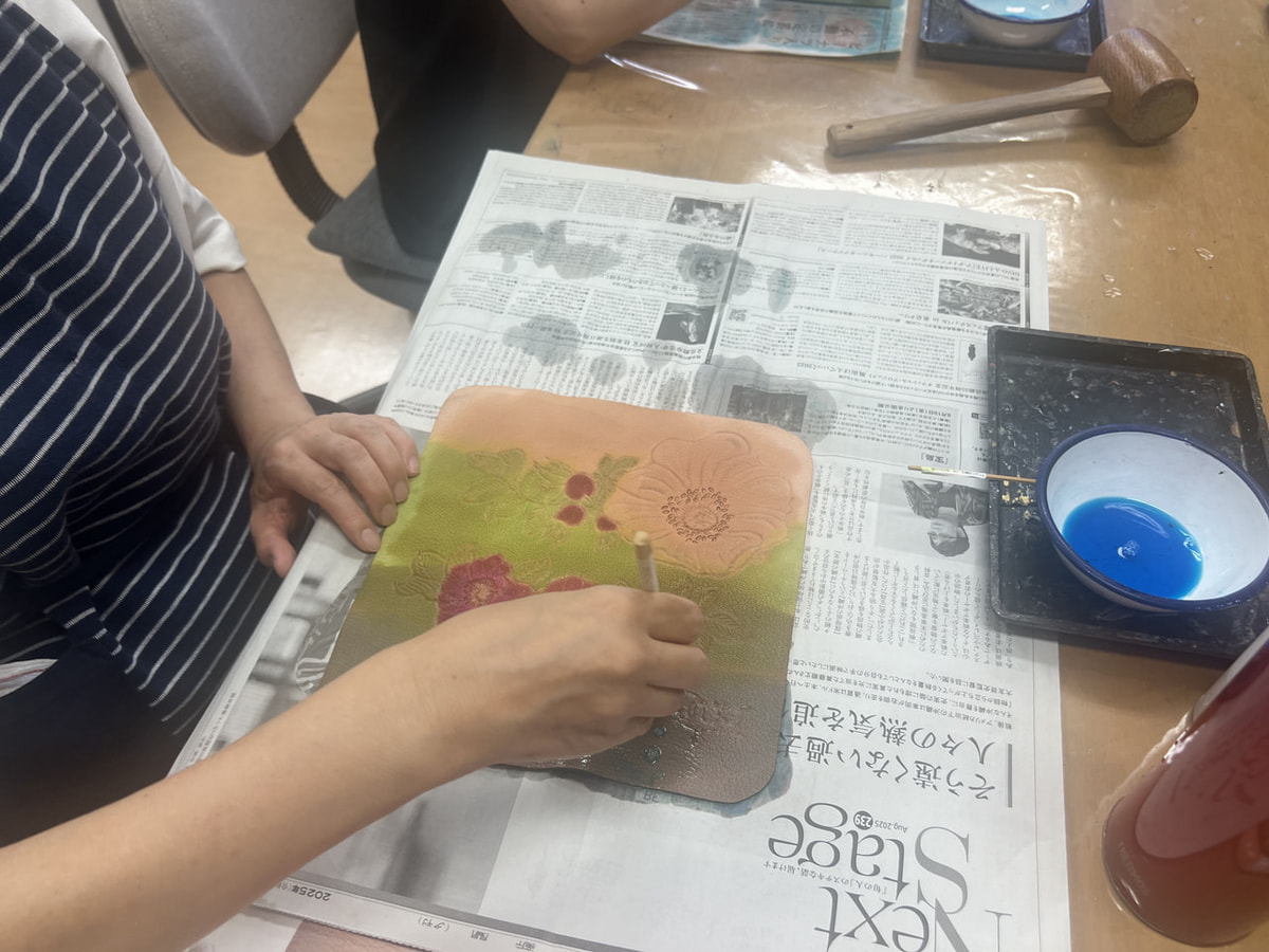 水曜から振替のKHさん、高等科2作目のパス入れの染色中。次回は仕上がるかな?楽しみです。