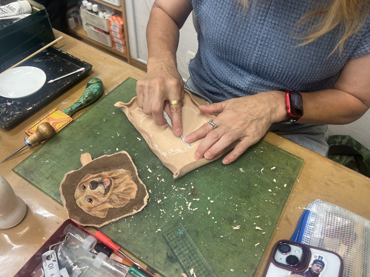 KIさん、初等科の課題、ペン立てを制作中。これは刻印の打ち方とぼかし染めを学んでもらうための課題です。良い感じに染まっていますね。次回は仕立て、楽しみです。