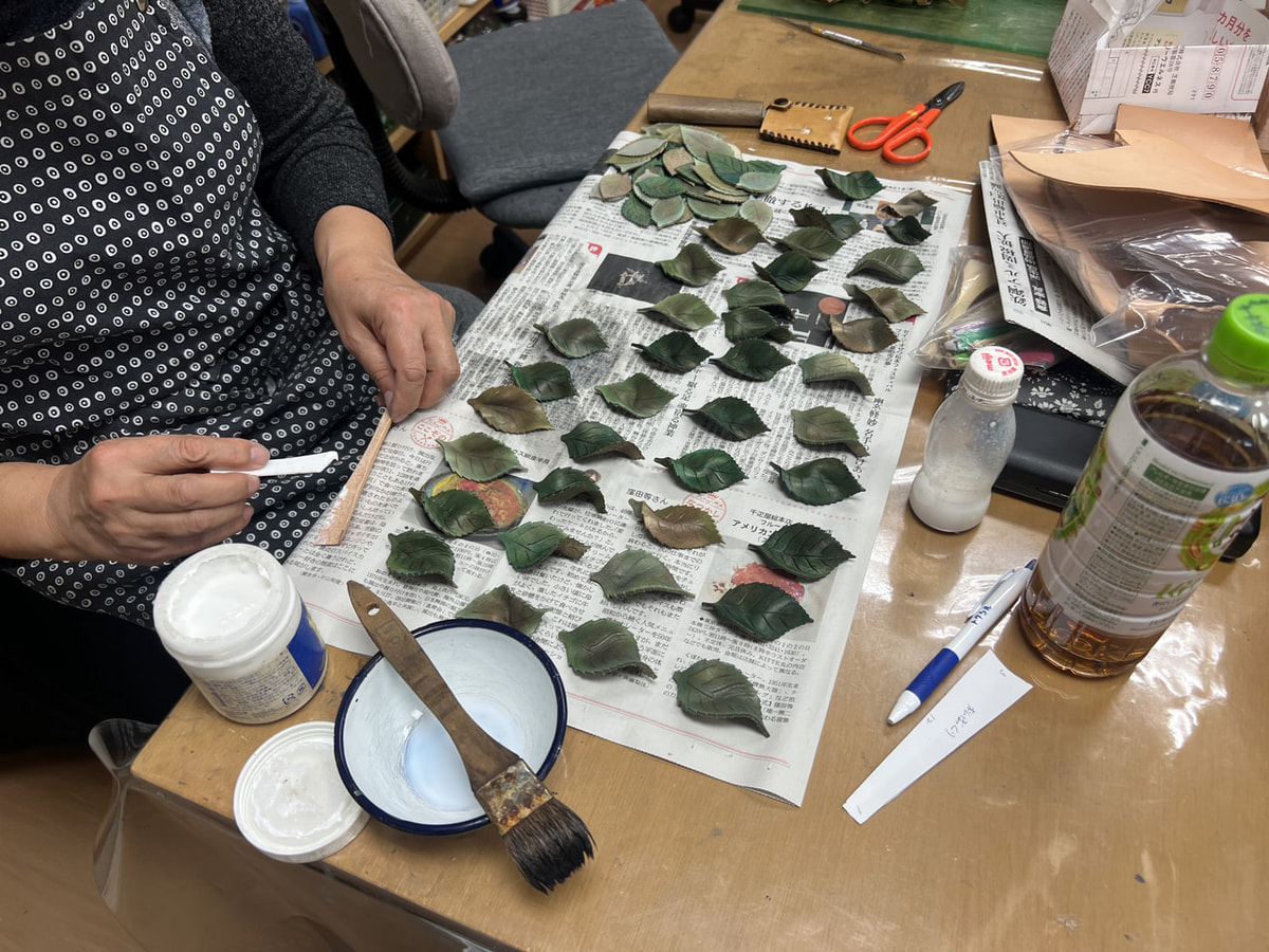 ろうけつ染んクラスで染めた革でティッシュボックスを作っているTKさん、染めた革で次々と色々なものを作っていきます。染めたものが貯まっちゃうという生徒さんが以前にいたけど、彼女のようにどんどん利用してくれると嬉しい!![]()