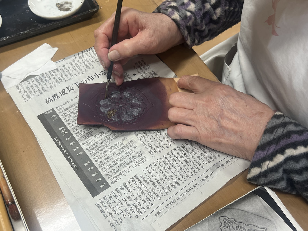 TKさん、ワンポイントのカービングに染色中。アクリルカラーのグレー、なかなか便利な色ですよ。![]()