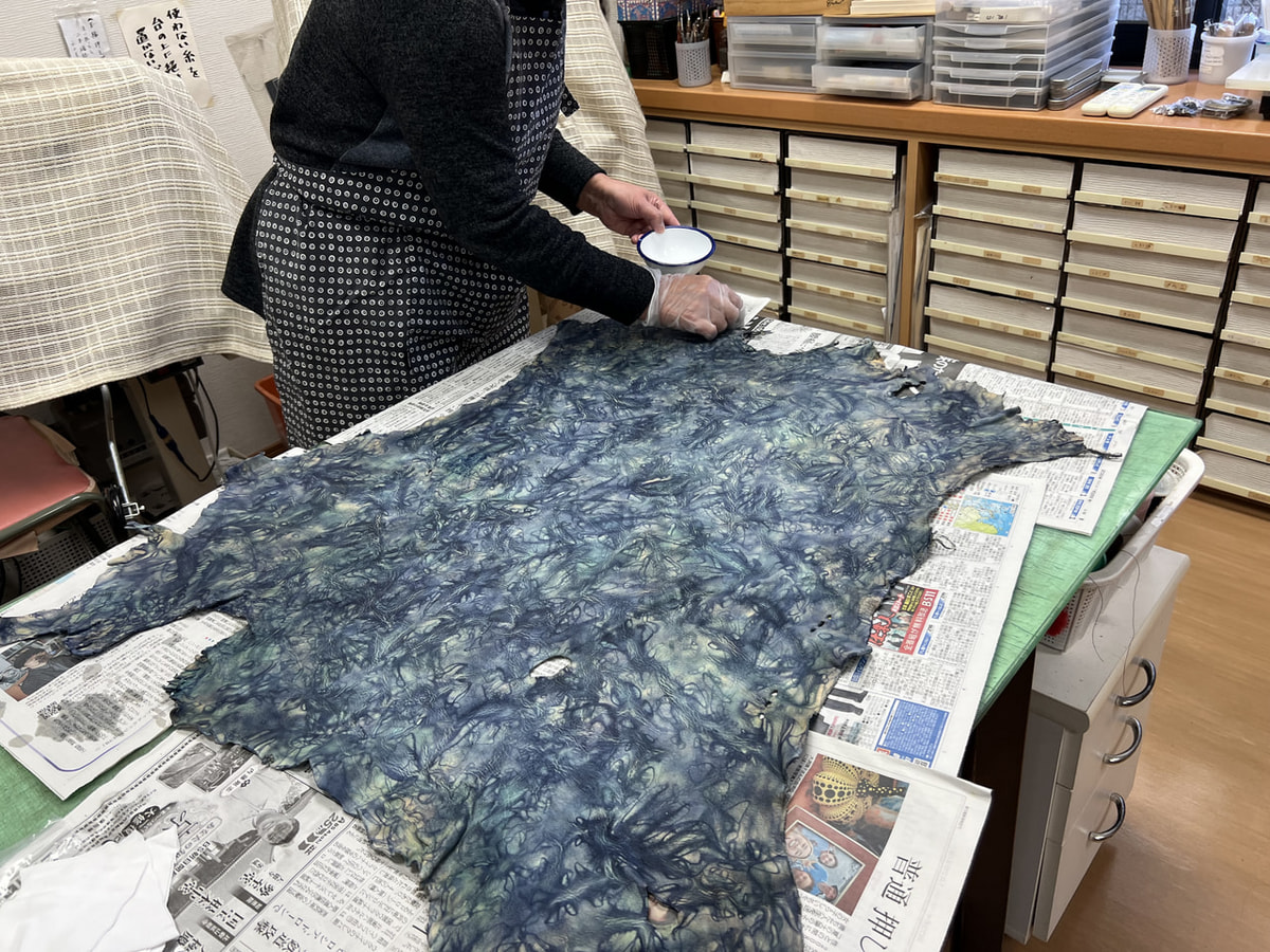 MIさん、鹿革で叢雲絞り染め。今までは裏ように薄い革が多かったけど、ちょっと厚い革も良い感じですね。![]()
