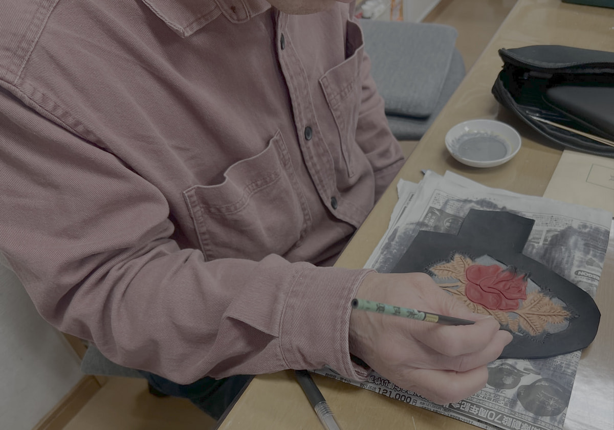 3週目はろうけつ染をしているNSさん、ずっとお一人臈纈で頑張っていたYIさんが体調不良でおやすみ中なので、一人で頑張っています。![]()