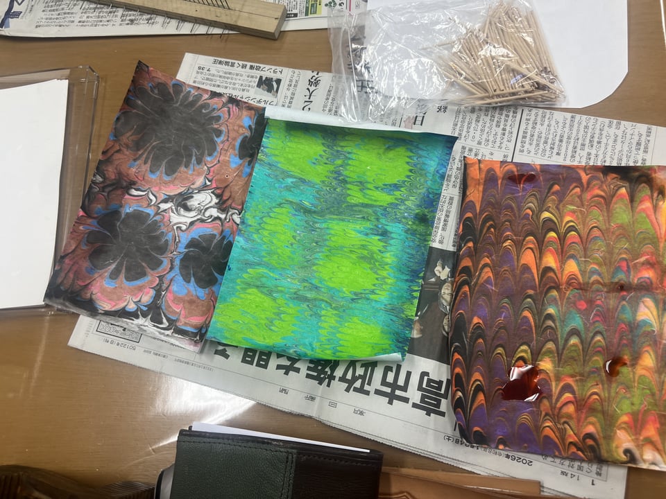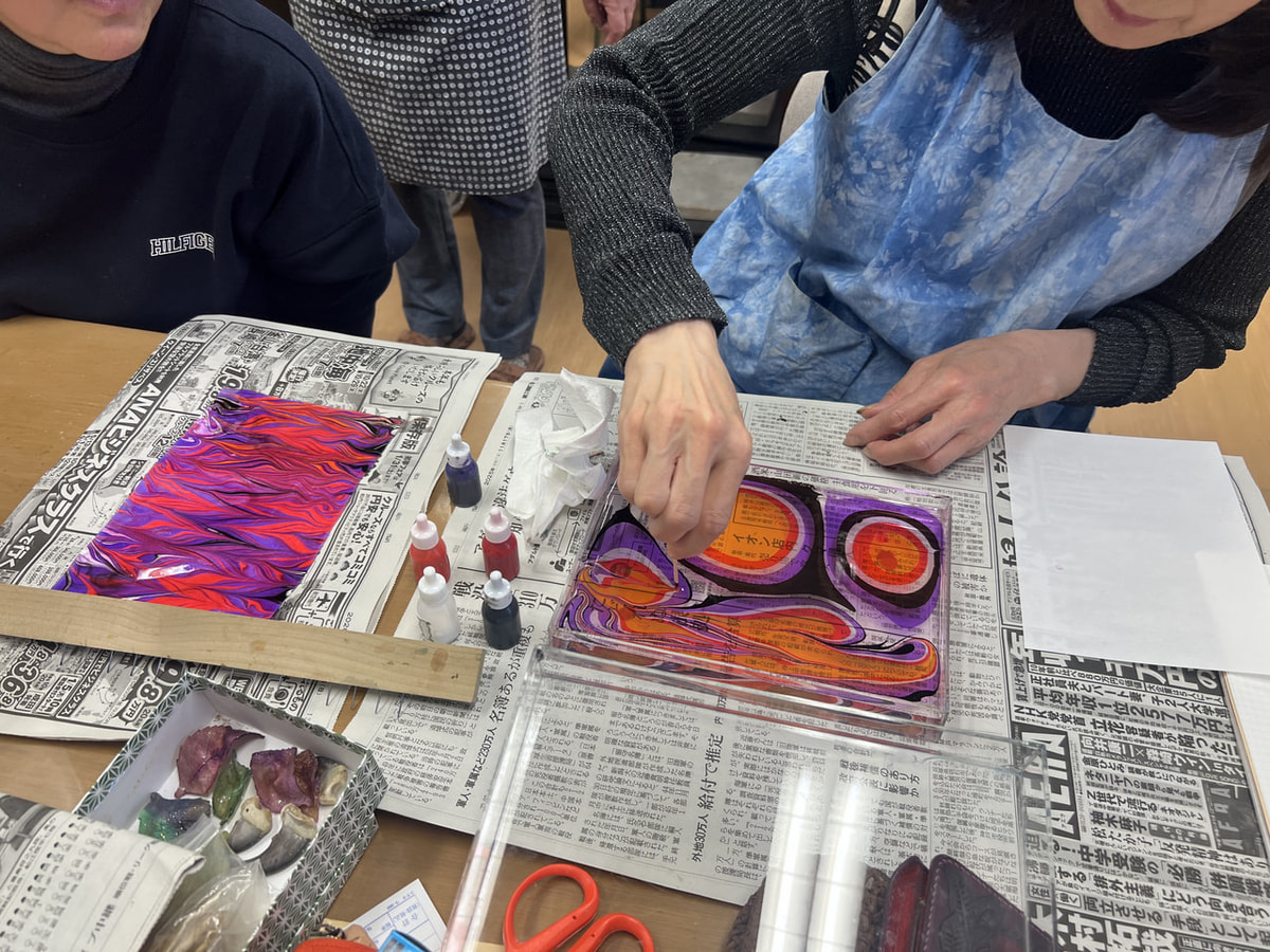 この日はひょんなことからマーブル染めの話になり、やったことのない人は興味津々。以前に買ったセットを持ってきて、ほぼ全員でマーブル染め祭り。